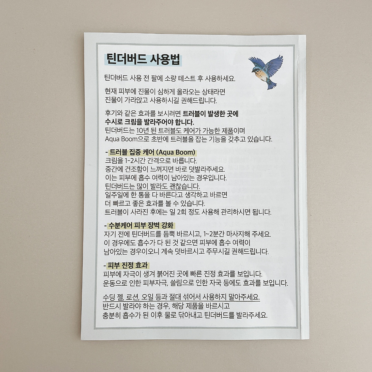 틴더버드는 단독 사용을 권장합니다. 다른 수딩젤, 로션, 오일을 꼭 바르셔야한다면 바르고 충분히 흡수가 된 이후 물로 닦아내고 틴더버드 크림을 발라주세요