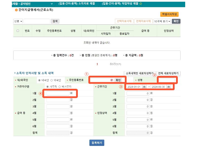 3. 일용 ·간이 ·용역 소득자료 제출 클릭